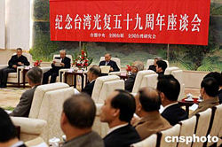 臺盟中央、全國臺聯(lián)、全國臺灣研究會(huì)十月二十五日在北京人民大會(huì)堂舉行座談會(huì),紀(jì)念臺灣光復(fù)五十九周年。中新社記者:毛建軍