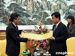 以日本外務(wù)省經(jīng)濟(jì)協(xié)力局有償資金協(xié)力課課長相星孝一為團(tuán)長的日本政府代表團(tuán)一行,于二十六日至二十八日到湖南訪問。代表團(tuán)此行旨在考察湖南人才培養(yǎng)和湘江流域環(huán)境污染治理等日元貸款項(xiàng)目。湖南省副省長賀同新(右)將工藝品《岳陽樓記》送給客人。作者:鄧霞