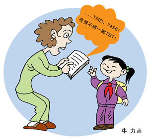 家住天津市和平區(qū)的許女士無意間發(fā)現(xiàn)女兒的日記中有這樣的文字:“……沒想到我最要好的朋友竟欺騙我,TMD(他媽的),7456(氣死我了),我恨不得一腳TST(踢死她)。”許女士看后不知所云,直到女兒一番解釋她才明白過來。許女士無奈地對記者說:“這是什么話呀,日記本成了密碼本,根本看不明白!看來我和孩子之間已經(jīng)有了‘網(wǎng)絡溝’!