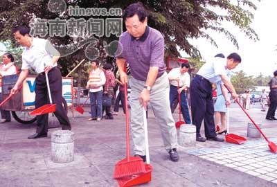 南國都市報報道,26日上午8點50分,海南省委副書記、省長衛(wèi)留成在?诤P銝|路明珠廣場前,拿著掃把和簸箕,順著路面一直往東清掃過去,碰到粘在路面上的紙片、桔子皮,就蹲下身去把它們摳出來。