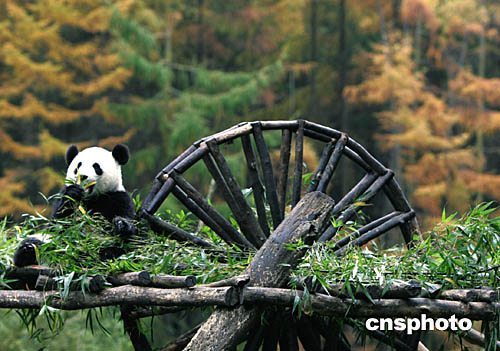 深秋時節(jié),四川臥龍大熊貓保護基地層林盡染,基地幼兒園的大熊貓寶寶無憂無慮地嬉戲于這片人類精心建造的、與大自然接壤的“大熊貓樂園”中。中新社記者:任晨鳴