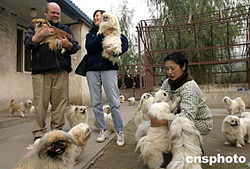 國際愛護動物基金會總裁弗雷德·奧雷根(左)十月末來到北京昌平,參觀這里的北京人與動物環(huán)?破罩行。該中心由張呂萍女士(右)創(chuàng)立,是中國唯一一家政府批準的民間動物收容、保護機構(gòu),也是國際愛護動物基金會在中國的資助項目之一。目前該中心已收容、救治遭遺棄或虐待的貓、狗等動物一千多只。作者:張煒