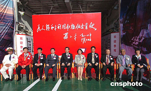 香港律政司司長梁愛詩等嘉賓登上“雪龍?zhí)枴逼票?#65104;并在鄧小平題詞下合影。