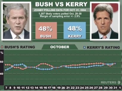 而路透/佐格比(Zogby)上周日公布的最新民調(diào)顯示,布什和克里再度打成平手。布什和克里在這項(xiàng)三天的全國追蹤民調(diào)中,均獲得48%的支持率,三天當(dāng)中有一天是在播出奧薩馬錄影帶后進(jìn)行調(diào)查。此前,克里在上周六的調(diào)查中以47%比46%,領(lǐng)先布什1個(gè)百分點(diǎn)。目前只有2%的選民尚未做出最后決定。