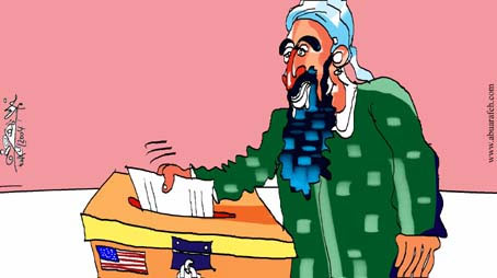 中新網11月1日電 10月29日晚,銷聲匿跡一年多的本拉登,在美國大選投票日來臨的前四天突然拋頭露面了。在半島電視臺播放了本拉登講話的錄像帶之后,分析家一致認為拉登此次露面是為了給美國大選施加影響,試圖影響美國大選的最終結果。半島電視臺網站于今日發(fā)表了一幅漫畫,在這幅漫畫當中,本拉登被描繪成一個重量級選民,他的講話被戲稱作是在為美國總統(tǒng)大選提前投票。(章田)