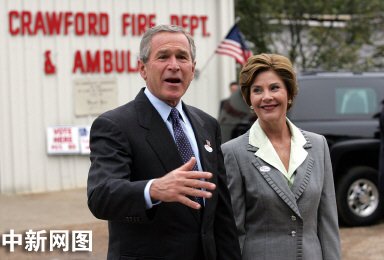 11月2日,美國總統(tǒng)布什與第一夫人勞拉在德克薩斯州的克勞福德投票后,向新聞界發(fā)表講話。