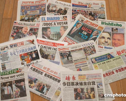 二○○四年十一月二日是美國大選日。當(dāng)天紐約報(bào)攤上的英文、中文和其他少數(shù)族裔語種報(bào)紙,一律聚焦總統(tǒng)選舉。作者:龔文謨