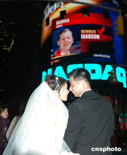 十一月二日美國大選日,一對華裔新人特意安排這一天在紐約結(jié)婚。晚上,新婚夫婦身著禮服,來到紐約時代廣場,一邊觀看大選結(jié)果揭曉的現(xiàn)場直播,一邊請人拍攝結(jié)婚紀念照。作者:龔文謨