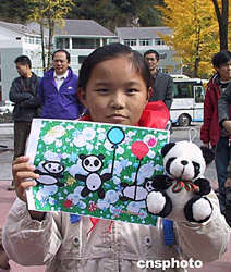 中國四川臥龍自然保護(hù)區(qū)是地球上僅存的大熊貓棲息地之一,其數(shù)量占全球大熊貓總數(shù)的百分之二十。圖為當(dāng)?shù)匾晃粌和谙蛴稳苏故咀约旱淖髌,呼吁保護(hù)世界最稀有的瀕危動(dòng)物大熊貓。作者:張華