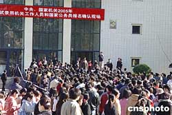 11月5日,已在網(wǎng)上報名參加2005年國家公務(wù)員考試的考生在北京農(nóng)業(yè)展覽館3號館進(jìn)行報名確認(rèn),現(xiàn)場人山人海,但井然有序。作者:張蕾