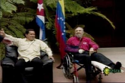 報(bào)道稱,卡斯特羅與查韋斯在上星期六晚上舉行了長(zhǎng)達(dá)八個(gè)小時(shí)的會(huì)談——這對(duì)于一個(gè)已經(jīng)78歲高齡的老人來說非常不易,考慮到他還剛剛摔了一跤,就更有點(diǎn)難能可貴了。電視臺(tái)的畫面顯示,卡斯特羅坐在輪椅上,腿打了石膏,胳膊也用吊帶吊在脖子上。此前,卡斯特羅在不慎摔倒后只在電視上出現(xiàn)過一次。當(dāng)時(shí)電視臺(tái)只播出他胸部以上部分的鏡頭。