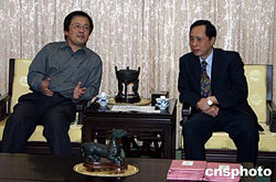 11月8日,大陸美術(shù)專業(yè)人士訪問團(tuán)參訪了臺北故宮。圖為訪問團(tuán)團(tuán)長、中國美術(shù)館館長馮遠(yuǎn)(左)與臺北“故宮博物院”副院長林柏亭交談,表示將加強(qiáng)交流與合作。中新社記者:董會峰