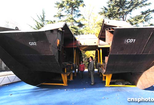專(zhuān)門(mén)用以走私汽車(chē)的特制“鐵甲飛艇”,在北京舉行的全國(guó)打擊走私成果展上展出。中新社記者:王麗南