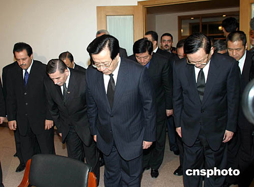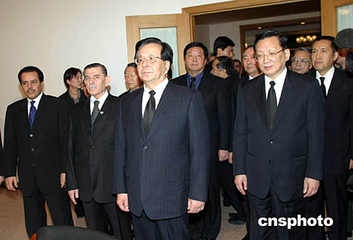曾慶紅、唐家璇在巴勒斯坦國(guó)駐華使館向阿拉法特主席靈像鞠躬哀悼。