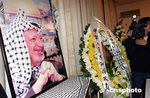 圖:中國政府向已故阿拉法特主席敬獻(xiàn)花籃