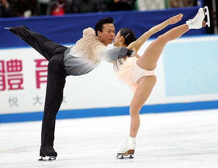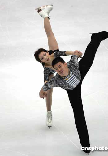 中國隊(duì)派出雙人滑第一組合、兩度世錦賽冠軍申雪/趙宏博出戰(zhàn),他們攜新編動作在加拿大站大獎賽上首演成功奪取冠軍。由于頭號種子俄羅斯選手托特米安妮娜/馬列寧的缺席,中國組合是參加本站比賽世界排名最高的運(yùn)動員。今天的短節(jié)目比賽,申雪/趙宏博在九對選手中第六個(gè)出場,盡管在做拋跳三周時(shí),申雪落地單手扶冰出現(xiàn)小失誤,但這并沒有影響他們之后的發(fā)揮,在《月光》悠揚(yáng)的樂曲聲中順利完成了八個(gè)規(guī)定動作,以六十六點(diǎn)三八分位列第一。