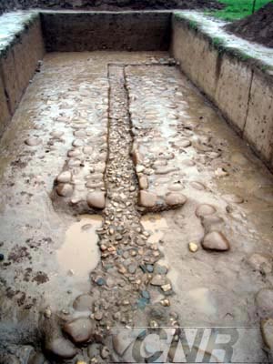 記者今天在考古現(xiàn)場(chǎng)看到,大型夯土建筑臺(tái)基南北寬四十五米,東西長兩百五十米,高九米,距地表七米,有縱橫交錯(cuò)的管道,證明此曾為一處大型宮殿。北面是宮殿的后花園,有一條由大小鵝卵石砌成的石渠。石渠東西長八點(diǎn)九米,渠西向北拐延伸四點(diǎn)九米,渠東向南拐延伸十七點(diǎn)四米,現(xiàn)存共長三十一點(diǎn)二米。渠心較窄,寬零點(diǎn)四米,深十二到十五公分,渠的底部鋪著一層比較大的卵石,渠壁也鑲嵌著一層卵石,排列整齊,渠壁兩邊各鋪著三排卵石,以“品”字型排列,制作非常精致,打磨光潔。