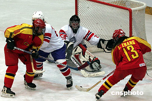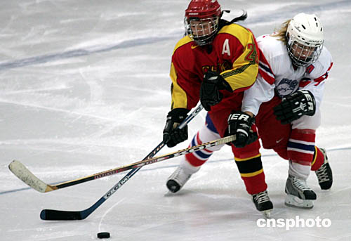 十一月十二日,在北京首體綜合館舉行的二零零四年女子冰球奧運會資格賽上,中國隊(紅)以十比零大勝挪威,取得兩連勝。中新社記者:武仲林