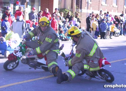 加拿大民意測(cè)驗(yàn)中最受百姓喜歡的消防員腳踏迷你小摩托,當(dāng)街表演。作者:蒲力