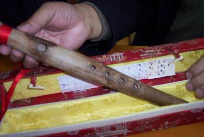 據(jù)收藏者介紹,“這支陶笛為商周時(shí)期文物,中國(guó)目前只有這一支,就連中國(guó)歷史博物館里也沒(méi)有!庇浾呖吹剑盏验L(zhǎng)20多厘米,大小如蠟燭一般。和普通的竹笛不同的是,它不但是陶制的,而且兩端封口,笛筒并不像一般的笛子那樣均勻,而是呈中間大兩端小的形狀。奇特的是,它的氣孔下面只有4個(gè)音孔。主人說(shuō),由于中國(guó)古代的音樂(lè)不成熟,所以管樂(lè)的音孔最早只有一個(gè),后來(lái)到唐代才發(fā)展到了6音孔!澳銊e看只有4個(gè)音孔,但音階很全,古樂(lè)、民樂(lè)都能演奏!闭f(shuō)著,他拿起這支陶笛,吹起了《小河淌水》、《青春舞曲》。聽(tīng)到3000多年前的樂(lè)器發(fā)出迷人聲音,現(xiàn)場(chǎng)的人都陶醉了。