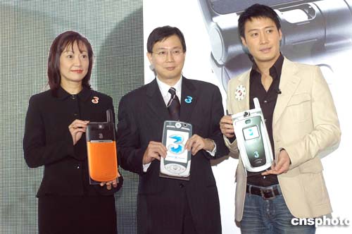 歌星黎明11月17日在香港出席和記電訊新型號3G視像手機(jī)推介記者會,和記電訊行政總裁呂博聞及3香港董事總經(jīng)理李家慧與及歌星黎明于記者會上,共同推介三大型號3G視像手機(jī)將強(qiáng)勢登場。作者:鄧慶樂