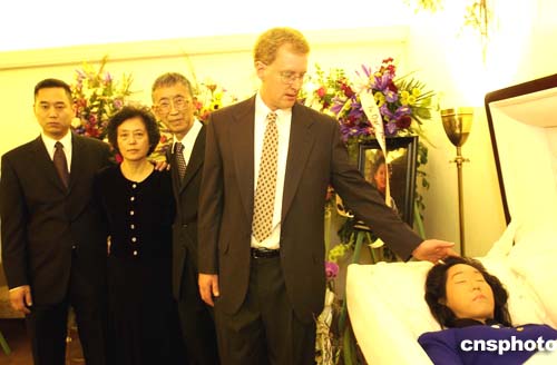 據(jù)美國僑報報道,遺體告別儀式從當(dāng)晚5時開始,在殯儀館門外的草坪上,安置著巨幅張純?nèi)缟半p眼緊閉、面帶沉思狀的彩色遺像。張純?nèi)绲倪z體安置在深紅色的靈柩內(nèi),神情安祥。張純?nèi)绲母改负驼煞蛸浰偷幕ㄈΠ卜旁陟`柩的上方。張純?nèi)缟白钕矏鄣囊粡埳钸z照在鮮花和絲帶的裝飾下陳列在靈堂的右方。