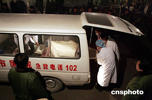 二零零四年十一月二十一日晚,經(jīng)過連續(xù)搜索搶救,河北省邢臺市沙河礦難死亡人數(shù)又有所增加,又有十多名礦工的遺體被抬出金鼎鐵礦巷口。中新社記者:武仲林