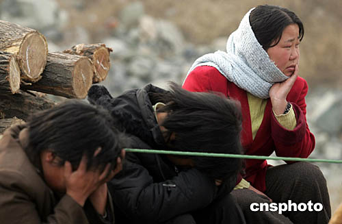 二零零四年十一月二十二日,“11.20”河北沙河礦難救援工作仍在進行。截止當(dāng)日十九時三十分,河北沙河礦難遇難礦工人數(shù)已達五十七人,另有三人人下落不明。圖為仍沒有獲救的遇難礦工家屬在礦井附近焦急等待。中新社記者:武仲林