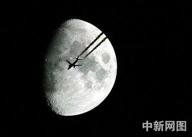 在德國紐倫堡的夜空中,一架客機(jī)飛過月亮?xí)r拍攝的圖片。