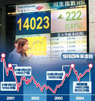 港股今早輕微高開(kāi)九點(diǎn),恒指開(kāi)市報(bào)一萬(wàn)三千八百零九點(diǎn)。后市況反覆向上,升幅不斷擴(kuò)大,至中午收市時(shí)恒指已突破一萬(wàn)四千點(diǎn)。下午,恒指一度高見(jiàn)一萬(wàn)四千零四十八點(diǎn)。在地產(chǎn)和工商股帶領(lǐng)下,港股以接近全日最高位收市。恒指收?qǐng)?bào)一萬(wàn)四千零二十三點(diǎn),升二百二十二點(diǎn),升幅百分之一點(diǎn)六,成交二百六十二點(diǎn)七億港元,比二十二日多了一半。