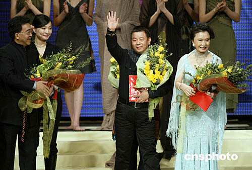 中國國際時裝周第八屆中國時裝設計“金頂獎”十一月二十五日晚在北京揭曉,“云敦至尊”品牌設計師計文波(中)摘得桂冠。中新社記者:盛佳鵬