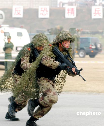 處置大規(guī)模劫持人質(zhì)事件演練中,兩名偽裝后的武警特戰(zhàn)隊員迅速出擊。