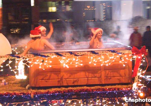 幾位少女頭戴圣誕帽、身著比基尼浸在熱水中以奇特方式向人們祝賀圣誕,令人“瞠目結(jié)舌”。