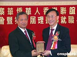 二十七日晚,柬埔寨華僑華人香港聯(lián)誼會(huì)在此間假借尖沙嘴海港城皇宮大酒店,舉辦成立慶典暨第一屆理監(jiān)事就職典禮。柬埔寨王國(guó)駐香港總領(lǐng)事館陳明光總領(lǐng)事(左)到會(huì)致賀辭,并接受首任會(huì)長(zhǎng)鄭中贈(zèng)送的紀(jì)念品。作者:關(guān)向東