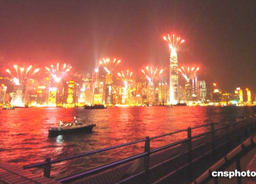為迎接圣誕節(jié)的到來(lái)﹐周日的香港島主要建筑物在晚間20時(shí)燃放煙花﹐使得維多利亞港灣呈現(xiàn)一派節(jié)日景象。