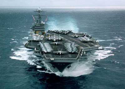 “尼米茲”號航母的主要動力裝置為2座核反應(yīng)堆及4臺蒸汽輪機,推進功率20.9萬千瓦,最大航速為30節(jié)。其主要武器系統(tǒng)為3座8聯(lián)裝“海麻雀”艦對空導(dǎo)彈發(fā)射裝置、3座“密集陣”近戰(zhàn)武器系統(tǒng)及SPS-49對空搜索雷達。該艦攜帶艦載機85架,F(xiàn)-14“雄貓”戰(zhàn)斗機、F/A-18“大黃蜂”戰(zhàn)斗/攻擊機、EA-6B“徘徊者”電子戰(zhàn)飛機、E-2C“鷹眼”預(yù)警機和S-3“海盜”反潛機等。(章田/雅龍)