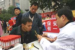 重慶市傳染病醫(yī)院的醫(yī)療人員上街免費(fèi)為市民抽血檢測HIV病毒。作者:郭晉嘉