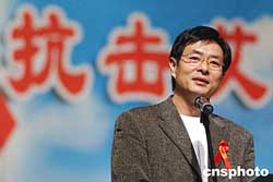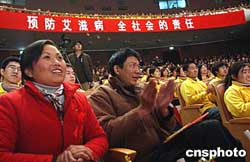 十二月一日,中國內(nèi)地演員濮存昕(右一)、蔣雯麗(左一)在“關(guān)注婦女,抗擊艾滋”活動(dòng)上,與來自四川資中公民鎮(zhèn)的艾滋病毒攜帶者同臺(tái)獻(xiàn)藝,該艾滋劇團(tuán)是由四川資中縣近二十名艾滋病感染者自發(fā)組建的。作者:韓藝冰
