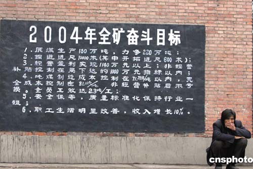 12月1日傍晚,陜西銅川礦務局陳家山煤礦被困井下礦工全部確認遇難后,一名工人無奈地蹲在礦區(qū)的“2004年全礦奮斗目標”宣傳牌前。有不少人認為,此次礦難的部分原因是礦方一味追求產(chǎn)量忽視安全造成的。作者:任晨鳴