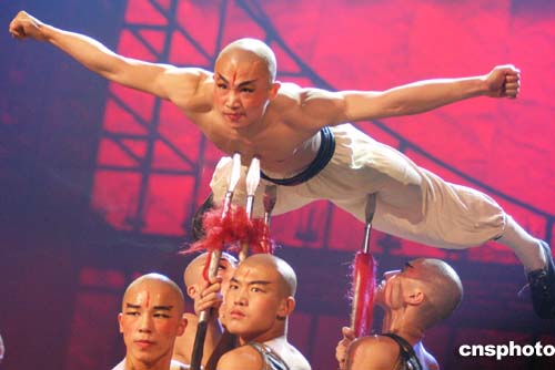 由天創(chuàng)國際演藝制作交流有限公司推出的耗資千萬元人民幣的大型常態(tài)功夫劇《功夫傳奇》十二月三日晚在北京首演,本劇以精湛絕倫的中華功夫、賞心悅目的舞蹈,表現(xiàn)了“磨難”與“成長”的人生主題。圖為《功夫傳奇》中表現(xiàn)鑄練場景。作者:張宇