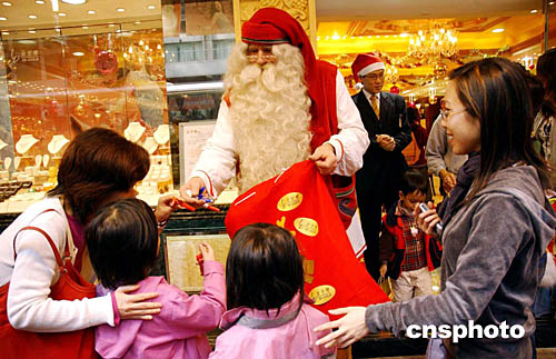 圖為圣誕老人在金至尊珠寶店向市民贈送禮物。