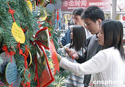 圣誕節(jié)臨近,福州市區(qū)節(jié)日氣氛漸濃。十二月六日,兩對有情人正往市區(qū)一大型商場前樹立的圣誕樹上懸掛許愿祈?ǎ涡履晷泻眠\(yùn)。作者:劉可耕