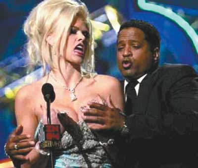 VH1音樂頻道2004頒獎(jiǎng)晚會(huì)日前在洛杉磯舉行,安娜·尼科爾·史密斯也應(yīng)邀參加,不知為何,當(dāng)她走到舞臺(tái)上后,突然脫去了裙子,露出了自己的雙乳,及時(shí)趕到的保安用手盡量遮擋住她的乳房,強(qiáng)行將她拉到了后臺(tái)。據(jù)一位觀眾說:“當(dāng)時(shí),史密斯看起來非常興奮,就在她脫裙子的一瞬間,一名保安把她拉到了后臺(tái)!笨墒牵搅撕笈_(tái)后史密斯仍然不老實(shí),她甚至想讓攝影師給她拍裸照。前不久,史密斯在參加美國音樂頒獎(jiǎng)晚會(huì)時(shí),也因精神恍惚、吐字不清令觀眾無法聽懂她在說什么,還一度趴在臺(tái)上睡覺,結(jié)果主持人打斷了她的講話,將她請(qǐng)下舞臺(tái)。有消息說,她當(dāng)時(shí)要么是喝醉了,要么就是受到了吸毒的影響,但她的律師解釋說,由于這位名模的視力不太好,所以無法看清自動(dòng)提詞機(jī)上的文字。