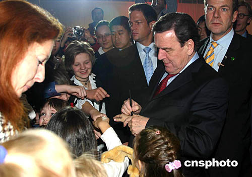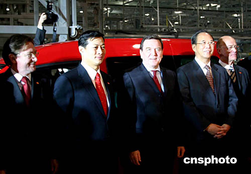 二00四年十二月七日,正在吉林省長春市進(jìn)行參觀訪問的德國總理施羅德,在中國副總理曾培炎陪同下,為當(dāng)日正式建成投產(chǎn)的中德合作項(xiàng)目大眾汽車有限公司轎車二廠剪彩。轎車二廠是一汽——大眾汽車有限公司新的生產(chǎn)基地。作者:吳兆飛