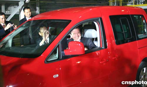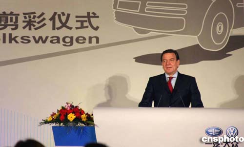 二00四年十二月七日,正在吉林省長(zhǎng)春市進(jìn)行參觀訪問(wèn)的德國(guó)總理施羅德,在中國(guó)副總理曾培炎陪同下,為當(dāng)日正式建成投產(chǎn)的中德合作項(xiàng)目大眾汽車(chē)有限公司轎車(chē)二廠剪彩。