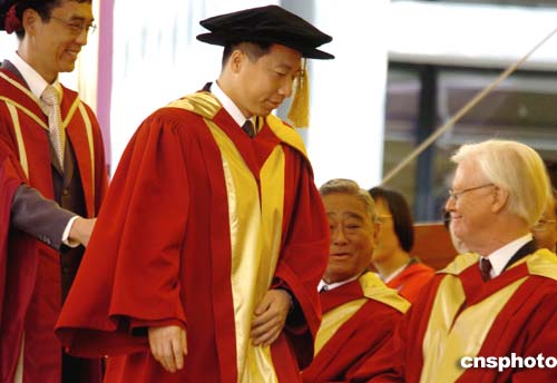 香港中文大學(xué)校長(zhǎng)劉遵義12月9日為中國(guó)首位登上太空的航天員楊利偉,頒授榮譽(yù)理學(xué)博士學(xué)位。作者:宋吉河