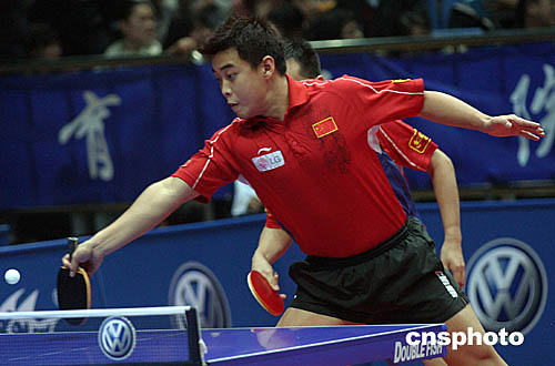十二月十一日,在北京舉行的二零零四年國際乒聯(lián)巡回賽總決賽結(jié)束了男雙半決賽的比賽,中國選手孔令輝和王皓繼隊(duì)友馬琳和陳杞之后,以四比一輕松擊敗奧運(yùn)亞軍、中國香港組合李靜和高禮澤,與隊(duì)友馬琳和陳杞會(huì)師決賽。圖為王皓、孔令輝在比賽中。中新社記者:盛佳鵬