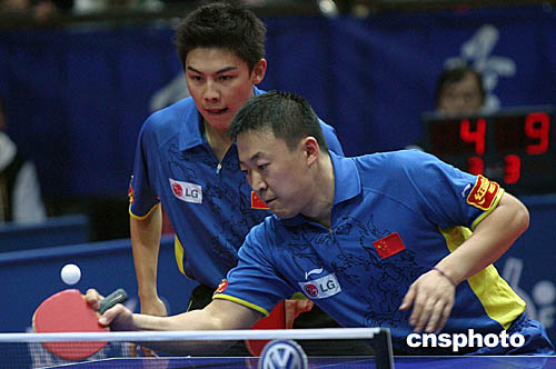 | 十二月十一日,在北京舉行的二零零四年國(guó)際乒聯(lián)巡回賽總決賽結(jié)束了男雙半決賽的比賽,中國(guó)選手馬琳和陳杞輕松擊敗對(duì)手進(jìn)軍決賽。圖為馬琳、陳杞在比賽中。中新社記者:盛佳鵬