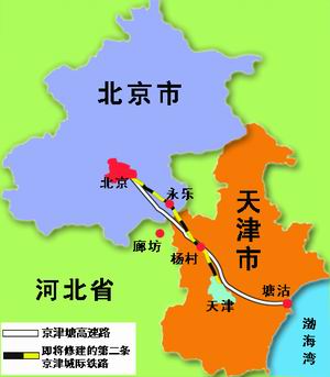 該線路規(guī)劃由北京南站東端引出,沿京津塘高速公路,經(jīng)永樂(lè)、楊村至天津站。京津城際軌道交通采用較快的速度標(biāo)準(zhǔn),車(chē)站設(shè)置盡可能覆蓋沿線主要城鎮(zhèn),既要實(shí)現(xiàn)快速度、公交化、大容量運(yùn)輸,又要充分滿足沿線各主要城鎮(zhèn)間日益頻繁的客流需求。項(xiàng)目建成后,可加速京津地區(qū)一體化進(jìn)程,促進(jìn)環(huán)渤海地區(qū)經(jīng)濟(jì)快速協(xié)調(diào)發(fā)展,并為北京舉辦奧運(yùn)會(huì)提供良好的運(yùn)輸條件。