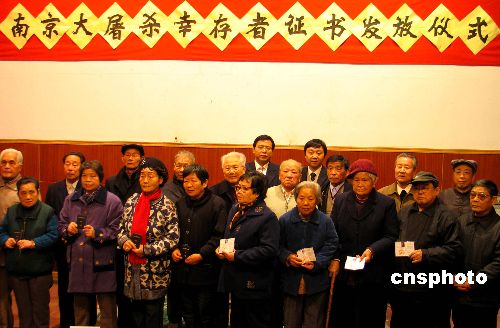 昨天,侵華日軍南京大屠殺幸存者援助協(xié)會(huì)向21位幸存者代表頒發(fā)了首批證書。首批獲得證書的共有179位幸存者。這本證書是對(duì)幸存者的身份和受害經(jīng)歷等自然狀況進(jìn)行了完整核實(shí)后統(tǒng)一制作的。幸存者們憑借該證可以享受政府和社會(huì)各界給予的援助和優(yōu)惠政策,并且可以憑證免費(fèi)參觀市內(nèi)七個(gè)文化場(chǎng)館、景點(diǎn)。